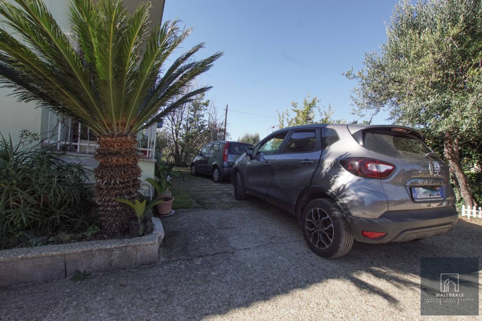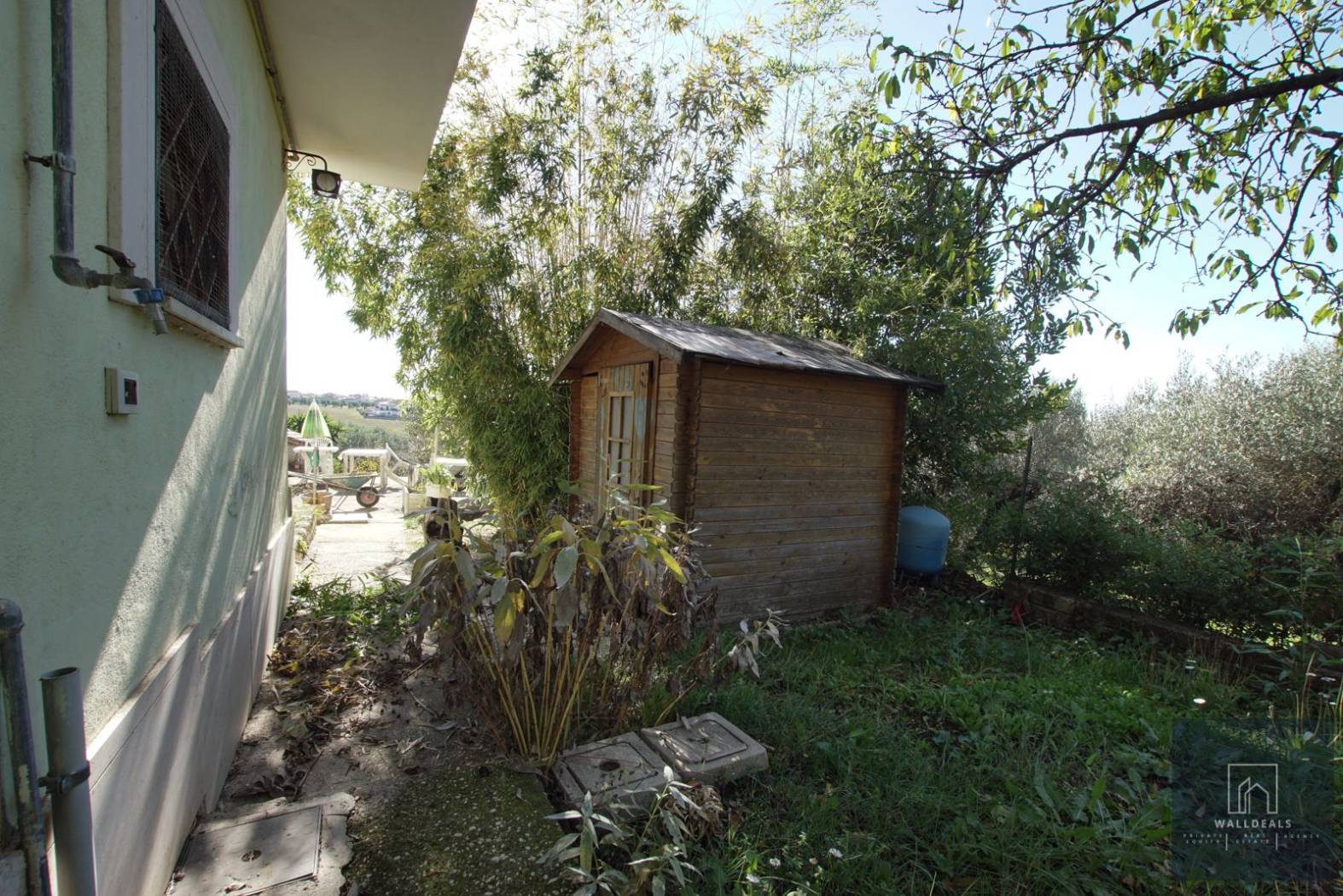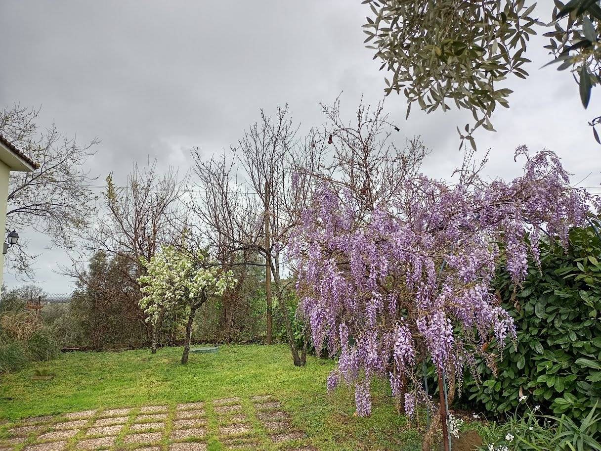 All'esterno, la proprietà è circondata da un giardino di circa 3.800 metri quadrati, in parte pavimentato e in parte piantumato con circa trenta ulivi e altre piante ornamentali. Gli ulivi sono in piena produzione: nel 2024 la raccolta ha prodotto due quintali di olive con una resa del dieci per cento, pari a circa venti litri di olio extravergine. Sono presenti inoltre un forno in muratura, una casetta in legno per gli attrezzi e diversi spazi dedicati alla vita all'aperto. All'interno del cancello carrabile elettrico si trovano quattro o cinque posti auto comodi in area privata.