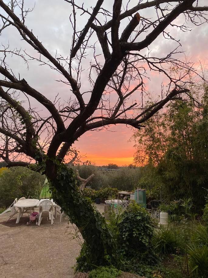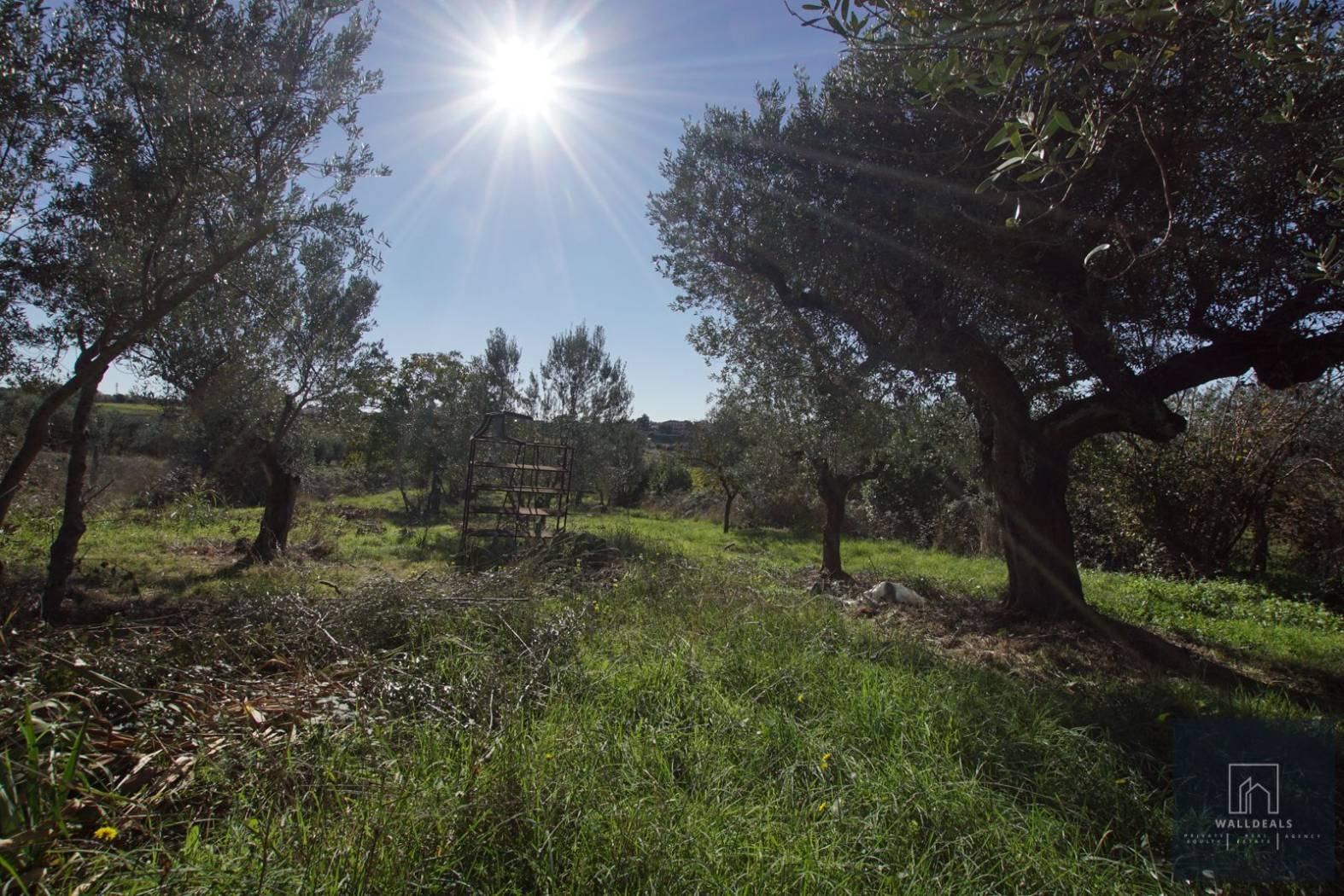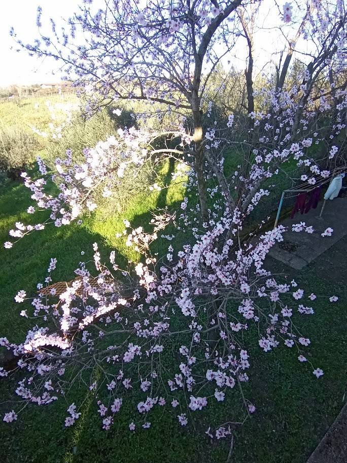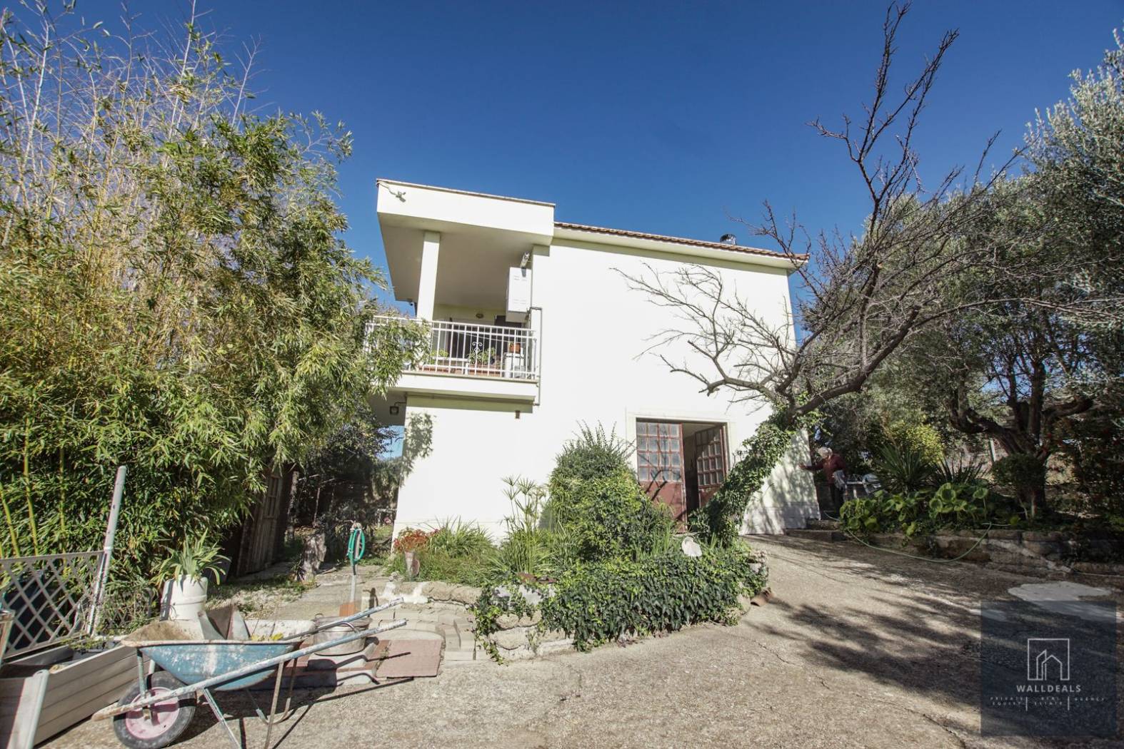 All'esterno, la proprietà è circondata da un giardino di circa 3.800 metri quadrati, in parte pavimentato e in parte piantumato con circa trenta ulivi e altre piante ornamentali. Gli ulivi sono in piena produzione: nel 2024 la raccolta ha prodotto due quintali di olive con una resa del dieci per cento, pari a circa venti litri di olio extravergine. Sono presenti inoltre un forno in muratura, una casetta in legno per gli attrezzi e diversi spazi dedicati alla vita all'aperto. All'interno del cancello carrabile elettrico si trovano quattro o cinque posti auto comodi in area privata.